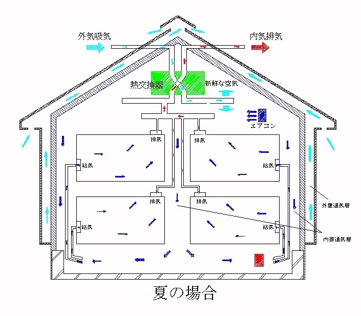 このエアコンに換気扇とダクトがついており、家の中の壁と壁の間の空洞部分に空気が通る空調システムを使用します。